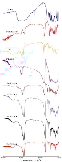 FTIR spectral studies were performed to investigate the possible chemical interactions between drug and excipients (PLGA, tristearin and SL). The FTIR spectra of BTB, PLGA, tristearin, SL and their corresponding B-PLNs (B-PLN1 to B-PLN4) are presented in Figure 2. The FTIR spectra of pure BTB assigned various characteristics peaks at wave numbers 3207 cm−1 (N-H stretching), 3119 cm−1 (aromatic =C-H stretching), 2842 cm−1 (-C-H stretching), 2263 cm−1 (-C=N stretching). FTIR spectra of SL showed a characteristic peak at 2924 cm−1 and 2856 cm−1 (-C-H stretching), 1738 cm−1 (-C=O stretching). FTIR spectra of stearin showed a characteristic peak at 2922 cm−1 and 2852 cm−1 (-C-H stretching), 1729 cm−1 (-C=O stretching) [45]. The FTIR spectra of PLGA indicated a strong peak at 1753 cm−1 (C=O stretching). The characteristic peaks of stearin and SL were observed in the spectrum of B-PLNs (B-PLN1 to B-PLN4), suggesting that BTB was successfully loaded inside the lipid shell.