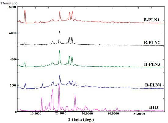 XRD spectra of BTB and formulated lipid-polymer nanoparticles (B-PLN1-B-PLN4).