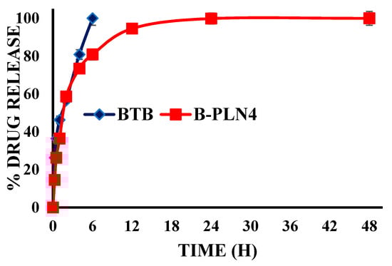 Comparative in vitro release profile of pure drug BTB and optimised B-PLN4 formulation.