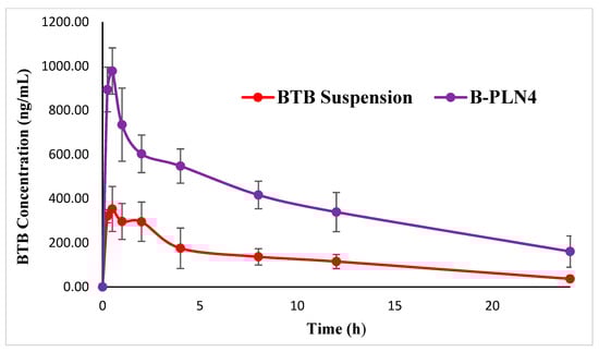 Comparative plasma concentration versus time profile of BTB after oral administration of BTB pure suspension and BPLN4 (1 mg/kg) in rats (n = 6).