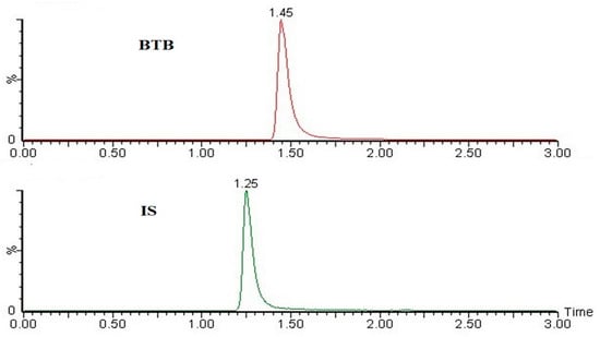 Representative MRM chromatogram of BTB and IS at Tmax after oral administration of 1 mg/kg of B-PLN4 formulation in rats.