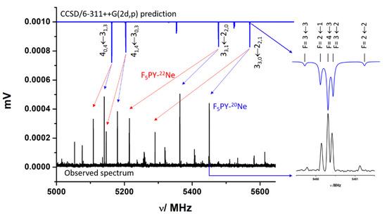 A section of the CP-FTMW spectrum in the 5.0–5.6 GHz region recorded from a supersonic jet expansion of F5PY diluted in Ne. The comparison with the prediction of the spectrum carried out from the rotational parameters predicted at CCSD/6-311++G(2d,p) (upper blue inverted trace) for F5PY-Ne complex helps to identify the patterns of the 40,4←31,3, 41,4←30,3 and 33,1←22,0, 33,0←22,1 doublets for both the parent (blue arrow) and 22Ne (red arrow) isotopologues. The excerpt compares the observed and predicted 14N quadrupole coupling hyperfine structure for the 33,0←22,1 transition where the components are identified by the quantum number F, taking values from (J + I) to (J − I) reflecting the coupling between the overall rotation moment (J) and 14N nuclear spin moments (I = 1).