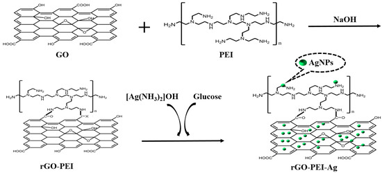 The rGO-PEI-Ag nanocomposites were prepared according to the literature with a little change [36,37]. Figure 1 showed the basic synthesis process of nanomaterials. The specific synthesis process of rGO-PEI and rGO-PEI-Ag are described in the Supporting Information.