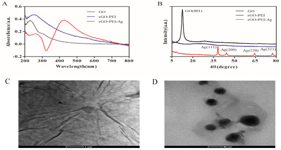 UV-Visible spectra (A) and XRD patterns (B) of GO, rGO-PEI and rGO-PEI-Ag; TEM image of GO (C) and rGO-PEI-Ag (D).