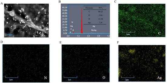 In order to further confirm the synthesis of nanocomposites, the ultrasonic treated GO and rGO-PEI-Ag solution were dripped onto copper meshes respectively, and observed by TEM. In Figure 2C, we could see that the GO nanosheets exhibited a wrinkled morphology. Figure 2D showed that minute AgNPs with diameters around 40 nm were stably distributed on the rGO-PEI sheets. These phenomena were in line with the previous literature [41]. SEM was also used to observe the appearance of rGO-PEI-Ag. Figure 3A showed that AgNPs were uniformly dispersed in the surface of rGO-PEI. The EDS results showed that C, N, O and Ag elements appeared in the nanocomposites, which proved that the rGO-PEI-Ag nanocomposites were formed in Figure 3C–F. These observation results suggested that PEI was successfully grafted onto rGO surface and the nanomaterials were successfully synthesized.