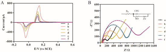 CVs (A) and EIS (B) of the same electrode at different stages. a. bare gold electrode, b. rGO-PEI-Ag-Nf, c. SPA/rGO-PEI-Ag-Nf, d. anti-ASA/SPA/rGO-PEI-Ag-Nf, e. BSA/anti-ASA/SPA/rGO-PEI-Ag-Nf, f. ASA/BSA/anti- ASA/SPA/rGO-PEI-Ag-Nf.