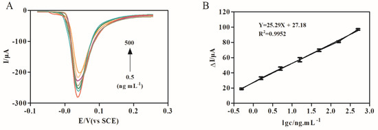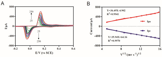 In addition, we investigated the CV response of the sensor at different scanning speeds of 25–250 mV s−1. In Figure 5A, we could see that the peak current gradually increased with the increase of sweep speed. Figure 5B showed the oxidation peak current (Ipa) and reduction peak current (Ipc) were linear with the square root of sweep rate (v1/2). The linear regression equations were Ipa (μA) = 36.49X − 4.902 with a correlation coefficient of 0.9941 and Ipc (μA) = −35.94X + 64.16 with a correlation coefficient of 0.9970. The results showed that the redox process of immunosensor was controlled by diffusion [43].