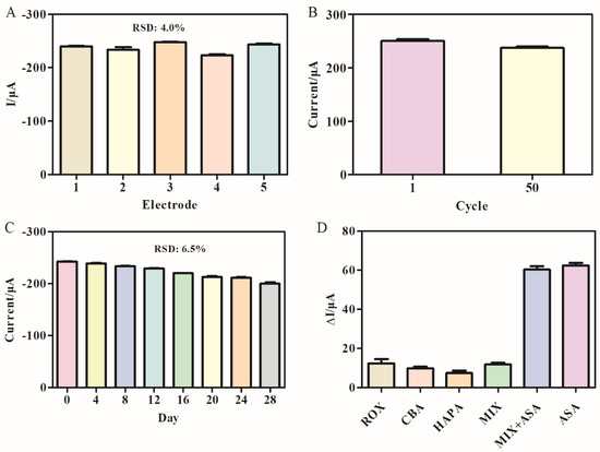 Reproducibility, stability and selectivity were used to assess the electrochemical performance of the prepared immunosensor. Five gold electrodes were prepared in the same conditions for the determination of ASA samples. As shown in Figure 7A, the relative standard deviation among them was 4%, showing that the prepared sensor showed good reproducibility.