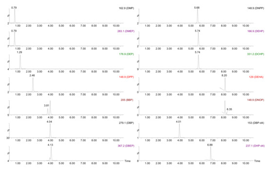 In order to guarantee a correct separation and determination of these molecules, and bearing in mind that a single quadrupole (Q) analyzer was used, a UHPLC method previously optimized for a similar group of compounds [25] was selected (fully described in Section 3.2). The mass spectrometer (MS) was initially operated in the full scan mode (using the chromatographic separation) to select the most intense ion for quantification in the single ion monitoring (SIM) mode. Once the optimal conditions were established, the possible contribution to the signal of compounds with close retention times was evaluated and, in that case, new ions were selected. Dibutyl phthalate-3,4,5,6-d4 (DBP-d4) was used as internal standard (IS) for DMP, DMEP, DEP, DPP, BBP, DBP, DBEP, DEHP, DNPP and DCHP (Rt < 6.0 min) and dihexyl phthalate-3,4,5,6-d4 (DHP-d4) was employed for DEHA and DNOP (Rt > 6.0 min) due to their similar behavior to those substances. Adequate separation was observed for the target analytes with a total analysis time of 11 min. Figure 1 shows the chromatograms obtained under these conditions for the selected analytes injected at 150 µg/L.