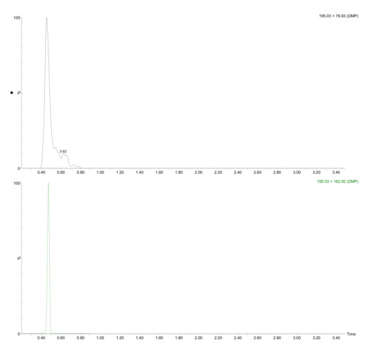 It should be mentioned that no residues of DEHA and DEHP were found (both with restricted limits regulated by the US EPA [34] and WHO [35] in drinking waters. The use of DEHA as an alternative to DEHP is becoming increasingly popular in food contact films and PVC plastics [36]. In addition, its high migration potential [37] and its similar metabolism to DEHP (although more lipophilic), make this compound one of the more hazardous plasticizers. The absence of this compound is good news from a food security perspective. DBP, which migration limit is 0.3 mg/kg in the Commission Regulation No 10/2011 on plastic materials and articles intended to come into contact with food, was detected in five plastic bottles at a concentration lower than LOQ. Figure 2 shows the UHPLC-MS/MS confirmation chromatogram for DMP in sample K2.