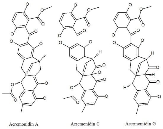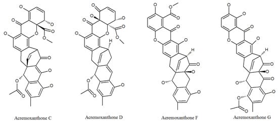 Acremonidins (Figure 2, Table 1) and acremoxanthones (Figure 3, Table 1) are kinds of polyketides (PKs), which contain alternating carbonyl and methylene groups, usually involved in cell defense or intercellular communication.