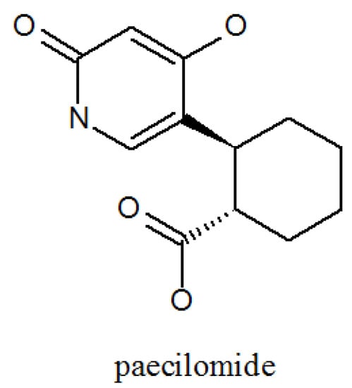Teles found a new α-pyridone Paecilomide (Figure 4, Table 1) by adding salmonella typhimurium to a flask containing P. lilacinum in two different concentrations and three different forms at two different stages of the development of P. lilacinum. He observed that adding a small amount of inoculum produced a living extract, while adding a large amount of inoculum led to the extraction of active extract, paecilomide []. It is an acetylcholinesterase inhibitor [,].