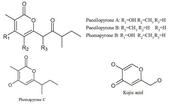Elbandy isolated 13 compounds from the sponge-derived fungus P. lilacinum in 2009, four of which were α-pyrones: paecilopyrone A, paecilopyrone B, phomapyrone B, and phomapyrone C; and one γ-pyrone: kojic acid (Figure 5, Table 1). Paecilopyrone A and its linear analog paecilopyrone B may be derived from pentaketide; unfortunately, the detailed synthetic pathway is still unclear []. Kojic acid showed antibacterial activities and tyrosinase inhibitory activity [,].