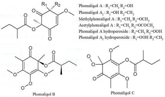 Phomaligol A, phomaligol A1, methylphomaligol A, acetylphomaligol A, phomaligol A hydroperoxide, phomaligol A1 hydroperoxide, phomaligol B, and phomaligol C were all isolated from the culture of P. lilacinum (Figure 6, Table 1). All of them are yellow oil. Phomaligol A and Methylphomaligol A both showed cytotoxicity against a small panel of human solid tumor cell lines []. Phomaligol A, phomaligol A1, phomaligol A hydroperoxide, and phomaligol A1 hydroperoxide were previously isolated from Phoma lingam and Phoma wasabiae, but their biological activity has not been reported yet [,].