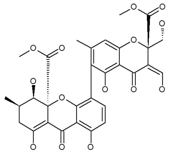 - Ayers, S.; Graf, T.N.; Adcock, A.F.; Kroll, D.J.; Shen, Q.; Swanson, S.M.; Matthew, S.; de Blanco, E.; Wani, M.C.; Darveaux, B.A.; et al. Cytotoxic xanthone-anthraquinone heterodimers from an unidentified fungus of the order Hypocreales (MSX 17022). J. Antibiot. 2012, 65, 3–8. [Google Scholar] [CrossRef]