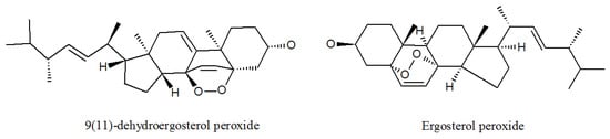 Professor Cui and his team isolated seven compounds from the metabolites of P. lilacinum ZBY-1 identified as 9(11)-dehydroergosterol peroxide, ergosterol peroxide (Figure 8, Table 1), (22E,24R)-5α,6α-epoxy-3β-hydroxyergosta-22-ene-7-one, and cerebrosides A, B, C, and D. 9(11)-dehydroergosterol peroxide, ergosterol peroxide, and (22E,24R)-5α,6α-epoxy-3β-hydroxyergosta-22-ene-7-one had the inhibitory effect of human cancer K562, MCF-7, HL-60, and BGC-823 cells, with their IC50 values on these cell lines ranging from 9.5 mg/L to 59.6 mg/L []. 9(11)-dehydroergosterol peroxide and ergosterol peroxide were found to be useful for developing a therapeutic candidate for lung cancer complications [,]. These three compounds all show high medical value and provide good materials for the research and development of anti-cancer drugs.