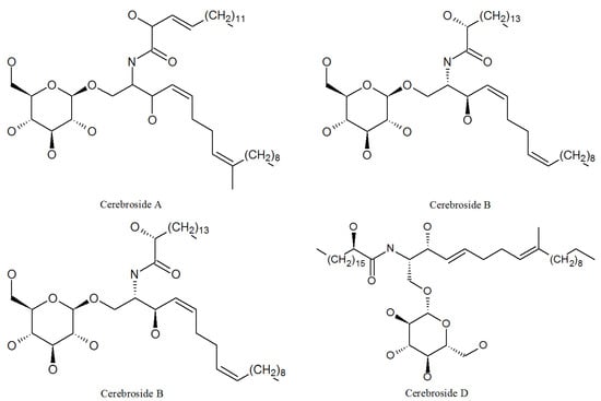 Cerebrosides A, B, C, and D (Figure 9, Table 1) were isolated from the P. lilacinum ZBY-1 strain by professor Cui in 2013, and they are all linear analogs. Cerebrosides function as a non-race-specific elicitor in a wide range of plant-phytopathogenic fungus interactions []; cerebrosides A and B have significant effects of analgesia and brain protection []. Cerebrosides C and D were known to potentiate the activity of cell wall-active antibiotics []. In addition, cerebrosides A and C play a role in cell growth, differentiation, and apoptosis in animals [].