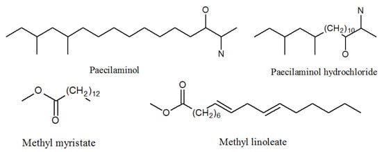 Cui found 11 compounds in the year of 2012 identified as paecilaminol, paecilaminol hydrochloride, 1(2)-linolyl-2(1)-palmityl-glycero-O-4′-(N,N,N-trimethyl) homoserine, 1,2-dilinolylglycero-O-4′-(N,N,N-trimethyl) homoserine, Me myristate, Me linoleate, linoleate, oleic acid, indole-3-carboxaldehyde, indolyl-3-carboxylic acid, and 4-hydroxybenzoic acid (Figure 10, Table 1). Compounds paecilaminol and paecilaminol hydrochloride have the ability to inhibit human cancer K562, MCF-7, HL-60, and BGC-823 cells. Compound paecilaminol was a major antitumor metabolite of the strain P. lilacinum ZBY-1 and it is also a NADH-fumarate reductase inhibitor [].