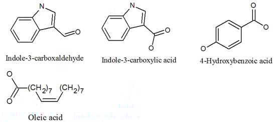 Indole-3-carboxaldehyde has useful antimicrobial properties, and it can inhibit the atopic dermatitis-like inflammation induced by MC903 [,]. Hydroxybenzoic acids such as 4-hydroxybenzoic acid and 3,4-dihydroxybenzoic acid have various functional biological properties, including anticancer, antibacterial, antiaging, antidiabetic, anti-inflammatory, and antiviral activities. They are widely used in food, cosmetic, and pharmaceutical industries []. In addition, 4-hydroxybenzoic acid increased after an organic intervention diet, and it may help with health-promoting qualities in the near future [,].