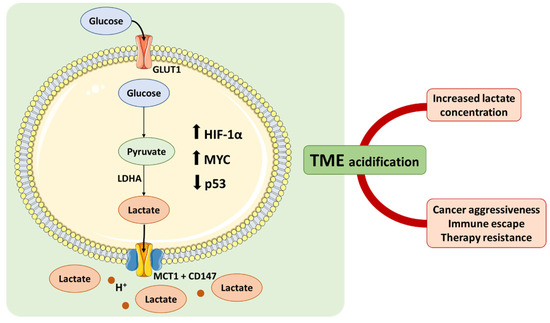 Malignant tumors uptake 47–70% of glucose from associated blood vessels, compared to 2–18% in normal tissues, and up to 66% of that glucose is converted to lactate, even in normoxic conditions [9]. Not surprisingly, lactate dehydrogenase isoform A (LDHA), an enzyme responsible for the transformation of pyruvate into lactate in the final step of anaerobic glycolysis, is upregulated in most malignancies [10]. LDHA expression is regulated by both c-myc oncogene and HIF-1 (Figure 1), and its increased activity reduces cells’ dependency on oxygen, as well as allowing for continuous glycolysis by regenerating NAD+ [10,11]. As a considerable amount of glucose is reduced to lactate, and to avoid cellular acidosis, lactate is exported from cells via MCTs, by a proton-coupled process. Accumulation of lactic acid and H+ in the TME leads to a significant decrease in pH, promoting immune escape, migration, and therapy resistance [12,13]. Lactate has also been suggested to play a role as a signaling agent both intra- and extracellularly. Intracellularly, lactate induces pseudohypoxia by HIF-1α stabilization and promotes angiogenic signaling by stimulating HIF-1α-mediated vascular endothelial growth factor (VEGF) expression. Extracellularly, lactate induces GPR81 activation in cancer cells, which has been reported to be linked to angiogenesis, proliferation (by, for instance, inducing MCT upregulation), enhanced DNA repair, and chemoresistance [14,15]. Not surprisingly, coupled with these important roles in tumor development, lactate has been associated with cancer aggressiveness, serving as a promising prognosis biomarker for some types of malignancies [16].