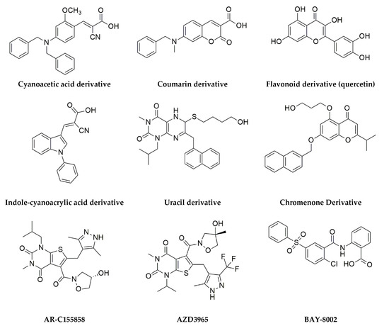 - Puri, S.; Juvale, K. Monocarboxylate transporter 1 and 4 inhibitors as potential therapeutics for treating solid tumours: A review with structure-activity relationship insights. Eur. J. Med. Chem. 2020, 199, 112393. [Google Scholar] [CrossRef]
