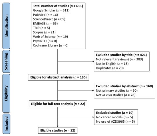 A literature search was conducted according to the Preferred Reporting Items for Systematic Reviews and Meta-Analyses (PRISMA) 2020 statement [34]. A total of 611 articles were first identified, as summarized in Figure 3. After screening, 190 studies were selected for abstract analysis, of which 168 were excluded, as these were not primary studies nor reported in in vivo experiments. The remaining studies (n = 22) were selected for full-text analysis, of which twelve studies were considered to comply with the selection criteria and included in this systematic review. The excluded studies contained no use of AZD3965 or its use to perform evaluations related to pharmacokinetics and testing of in vivo side effects, or no use of cancer animal models.
