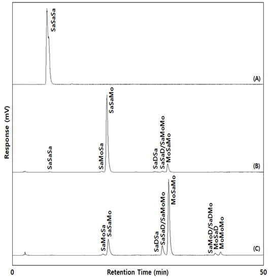 The TAG composition was analyzed with Ag-HPLC (Younglin, Anyang, Korea) equipped with a silver ion column of ChromSpher 5 lipids (pore size: 120 Å, particle size: 5.0 μm, 250 mm × 4.6 mm i.d., Varian, Middleburg, Netherlands) and evaporative light scattering detector (ELSD, Sedex 75, Sedere, Alfortville, France). The mobile phases were solvent A (n-hexane: acetonitrile: iso-propanol = 100:0.1:0.1, v/v/v) and solvent B (n-hexane: acetonitrile: iso-propanol = 100:1:1, v/v/v). The solvent gradient was started at a ratio of 100:0 (A:B, v/v) for 5 min, and changed to 80:20 for 45 min, to 50:50 for 10 min, and held for 1 min, then returned to the initial ratio, and finally held for 8 min. The fats were dissolved in chloroform: n-hexane (1:1, v/v), and the injection volume was 20 μL. The temperature of ELSD and flow rate was set at 40 °C and 1.5 mL/min, respectively, and N2 was used as a nebulizing gas at a pressure of 2.2 bar. The TAGs were separated with the number of double bond and the position (sn-1(or 3), sn-2) of fatty acids. In the obtained chromatogram of Figure 1, TAG was designated with saturated fatty acid (Sa), monounsaturated fatty acid (Mo), and diunsaturated fatty acid (D).