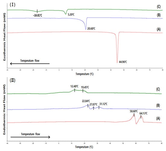 Figure 2 shows the crystallization and melting behaviors analyzed by DSC. Figure 2I shows that the crystallization onset temperatures of SSS-, SSO-, and OSO-rich fats were 46.63 °C, 21.73 °C, and 6.93 °C, respectively. The crystallization peaks of the SSS- and SSO-rich fats were distinct sharp at 44.96 °C and 20.68 °C, respectively, indicating that crystallization mostly occurs at these temperatures. In contrast, the OSO-rich fat had crystallization peaks at 5.20 °C and −16.81 °C in a relatively wide range from −20.61–6.93 °C, indicating two-step crystallization behavior because TAGs in the OSO-rich fat were more diverse than in the SSS-and SSO-rich fats (Table 4).