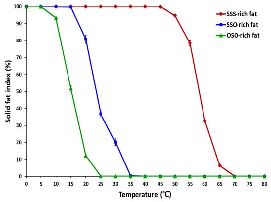 Solid fat content (SFC) is very important physical property of lipids, which express the amount of solid fat at the measured temperature. The monitoring of SFC is essential to assess the melting profiles. Figure 3 showed that the SFI obtained by the DSC analysis, the SSO-rich and OSO-rich fats started to liquefy from the temperatures of 15 °C and 5 °C, respectively, and the SSO-rich fat contained more solid fats than the OSO-rich fat showing SFIs of 99.7% and 51.8%, respectively, at 15 °C, and SFIs of 80.8% and 12.24%, respectively, at 20 °C. The SSO-rich fat still contained solid fat having SFIs of 36.9% and 20.1%, respectively, at 25 °C and 30 °C, while OSO-rich fat was completely liquefied after 25 °C. In contrast, the SFI of SSS-rich fat were 94.7%, 75.4%, 32.6%, and 6.35%, respectively, at 50 °C, 55 °C, 60 °C, and 65 °C and this fat was completely liquefied after 70 °C.