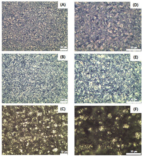Polarized light micrographs of SSS-rich fat ((A): ×20, (D): ×40), SSO-rich fat ((B): ×20, (E): ×40), OSO-rich fat ((C): ×20, (F): ×40). The scale bar represents 50 μm.