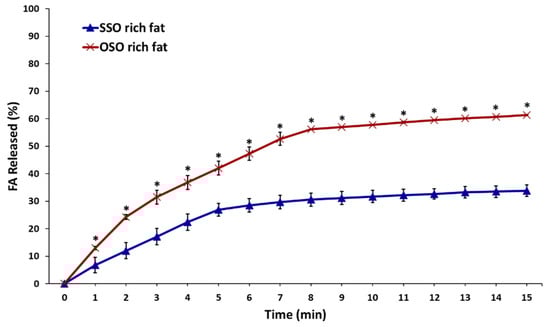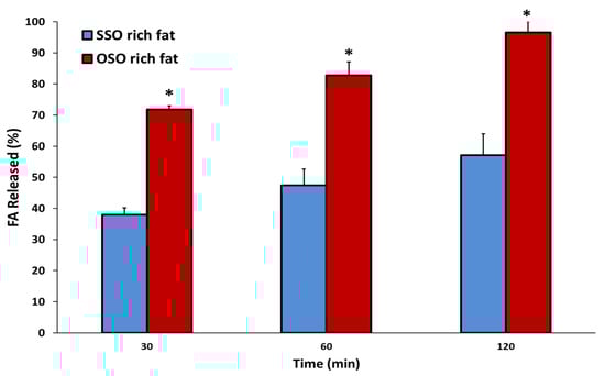 Free fatty acids released (%) of the SSO-rich fat and OSO-rich fat by in vitro pH-stat digestion model. * Mean on the graph are significantly different by Student’s t-test at p < 0.05.