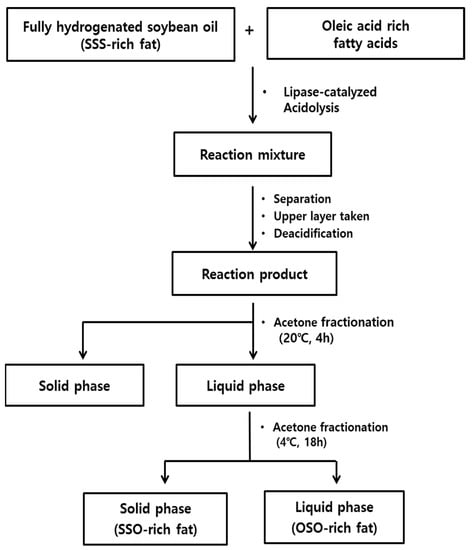 SSO-rich and OSO-rich fats were synthesized from FHSBO (SSS-rich fat) and oleic acid rich fatty acids by lipase-catalyzed acidolysis followed by acetone fractionation, as presented in Figure 7 [21]. The completely dissolved FHSBO was mixed with oleic acid (1:2 molar ratio) in an Erlenmeyer flask (500 mL) with screw cap. Lipozyme® RMIM (10%, w/w) and n-hexane (50 mL) were added and lipase-catalyzed acidolysis reaction was carried out in a shaking water bath at 200 rpm and 55 °C for 6 h. After reaction, the reactant was mixed with n-hexane (1:4, w/v), and placed in 20 °C for 1 h to separate unreacted FHSBO (high-melting TAG). The upper layer of n-hexane was collected, deacidified with 2 N KOH in ethanol, concentrated using a rotary evaporator (N-1110, Sunileyela, Seongnam-city, Korea), and dried completely with N2. The deacidified reactant was completely dissolved at 80 °C, and mixed with acetone (1:4, w/v) and fractionated at 20 °C for 4 h. The filtrated upper liquid phase was placed at 4 °C for 18 h, and fractionated into the solid phase (SSO-rich fat) and liquid phase (OSO-rich fat), and then dried with N2. For purification of TAG, each fractionated fat from liquid and solid phase was mixed with methanol (100 mL) for 30 min, and methanol layer was discarded (repeat 6 times), and dried with N2.