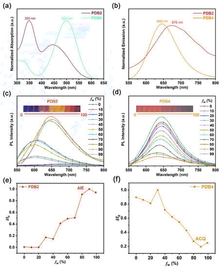 In contrast, the fluorescence intensity of PDB4 decreased gradually with the water fraction increasing. The distinct difference in the fluorescence intensity suggested a significant ACQ effect of PDB4 (Figure 1e,f).