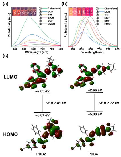 To investigate the ICT effect of PDBs in different solvents with various polarities, we measured the absorption and emission spectra of PDBs in a series of solvents with different polarities. As shown in Figure S7, there was almost no significant change in the absorption spectrum with the change in solvent polarity [30]. On the contrary, by changing the solvent from weakly polar dichloromethane (DCM) to highly polar DMSO, the emission peaks of PDB2 and PDB4 underwent a red shift from 600 to 676 nm and from 602 to 650 nm, respectively, which indicated a typical solvent discoloration effect (Figure 2a,b). At the same time, the fluorescent intensity of PDB2 decreased with the increase of the solvent polarity, which might be due to the positive solvatokinetic effect, while the fluorescence intensity of PDB4 increased with the increase of the solvent polarity, which might be due to the negative lysis-induced kinetic effect. This demonstrated that the ICT effect of PDB2 was stronger than that of PDB4 [29]. Meanwhile, DFT calculations on their energy levels were performed to study the ICT process of the PBDs. The Highest Occupied Molecular Orbital (HOMO) and Lowest Unoccupied Molecular Orbital (LUMO) are shown in Figure 2. The geometry in the PDB2 was more distorted than that of PDB4 (Figure 2c). The HOMO electron cloud of PDB2 was mainly located at the electron donor (i.e., pyrrole group) and its adjacent benzene ring, whereas the LUMO electron cloud of PDB2 was mainly located near the electron acceptor (i.e., cyan group). In contrast, the HOMO electron cloud of PDB4 was mainly delocalized over the conjugated backbone, with a small portion located at the electron donor. In contrast, the LUMO electron cloud of PDB4 was distributed similarly to that of PDB2. Meanwhile, the HOMO-LUMO gaps of PDB2 and PDB4 were 2.81 eV and 2.72 eV, respectively, which indicated that the HOMO and LUMO of these two compounds were separated well and that PDB2 may have a stronger ICT tendency [31,32,33]. We also used the Lippert Mataga plot to interpret solvent-dependent spectral shifts. The Lippert Mataga plot for PDB2 and PDB4 in various solvents is shown in Figure S8 and Table S1. If DCM and ethanol are omitted, the rest of the data show a linear correlation, which suggests that the emission spectra of PDB2 and PDB4 are related to the ICT effect [34].