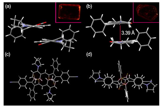 (a) Side view of PDB2; (b) Side view of PDB4; (c) Top view and illustration of no π–π stacking in PDB2; (d) Top view and illustration of the π–π stacking in PDB4. Inset: Photos of both the crystal PDB2 and PDB4 under natural light.