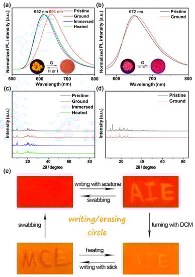 (a) Emission spectra of a pristine, ground sample, an immersed sample, and a heated sample of PDB2. (b) Emission spectra of a pristine, ground sample of PDB4. (c,d) Powder X-ray diffraction patterns of PDB2 and PDB4 in different states. (e) Photos of PDB2 in the writing/erasing cycle under UV light (λex = 365 nm). Inset: Photos upon irradiation with 365 nm UV light of PDB2 and PDB4 in different states.