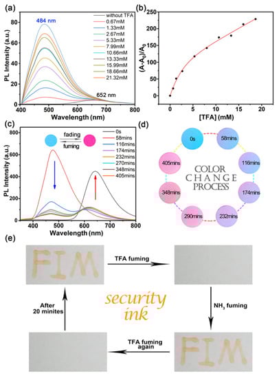 With the concentration of TFA increasing from 0 to 21.32 mM, the PL intensity maximum at 652 nm decreased and a new peak with a PL intensity maximum at 484 nm was formed. This change was due to the characteristic protonation of the pyrrolidine group and the formation of salt [29], while its ratio of fluorescence intensity had a quadratic function in a certain range of TFA concentrations (Figure 5b). However, the formation of this salt was not stable, and the fluorescence intensity of PDB2 was gradually recovered as time passed. Under UV light, we formed a drop of PDB2 in DCM on a piece of filter paper to form a violet-red circle, whose color changed into blue within a few seconds when fuming with TFA vapor; afterwards, the circle returned to violet-red when left at room temperature for some time. This process was further confirmed by the blue shift of the emission spectrum when treated with TFA (Figure 5c,d) [32]. In contrast, PDB4 did not react with trifluoroacetic acid (TFA) to produce these phenomena. The fluorescence of PDB4 was quenched with the addition of different concentrations of TFA, and the solution only emitted a faint red fluorescence under UV light (Figure S13) [33].