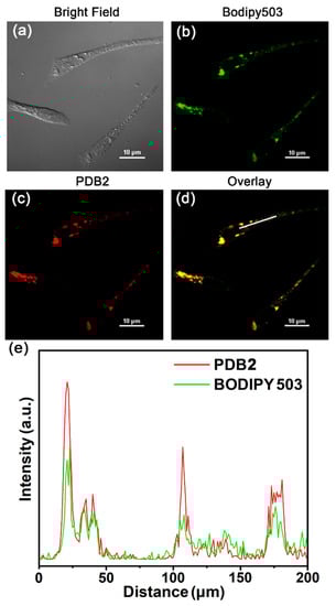 (a) Bright-field images of PDB2. (b,c) CLSM image of HeLa cells with BODIPY 503 (10 μM) and PDB2 (10 μM). (d) The merged images with BODIPY503 and PDB2. (e) The intensity profile of ROI lines. Scale bar = 200 μM (red and green channel, excitation wavelength, etc.).