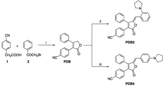 Synthetic routes for PDB2 and PDB4. Reaction condition: (i) Et3N, 25 °C, 30 min; DBU, −5 °C, 20 min. (ii) 2-(1-Pyrrolidinyl) benzaldehyde, piperidine, 25 °C, 24 h. (iii) 4-(1-Pyrrolidinyl) benzaldehyde, piperidine, 25 °C, 24 h.