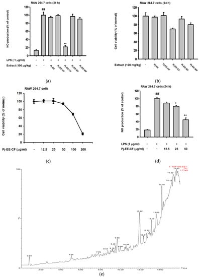 Effect of Pj-EE and its solvent fractions on the production of NO, cell viability profile, and phytochemical constituents of Pj-EE-CF. (a,d) Supernatant NO levels on LPS (1 μg/mL)-induced RAW264.7 cells pretreated with 100 μg/mL of Pj-EE, Pj-EE-HF, Pj-EE-CF, Pj-EE-BF, or Pj-EE-WF (a) and with the indicated concentrations of PJ-EE-CF (d) were analyzed using the Griess assay. (b,c) Cell viability of RAW264.7 cells upon treatment with Pj-EE, Pj-EE-HF, Pj-EE-CF, Pj-EE-BF, or Pj-EE-WF (b) and PJ-EE-CF (c) at the same concentration on NO assay were analyzed using an MTT assay. (e) The phytochemical screening performed on Pj-EE-CF using LC/MS-MS chromatogram. Results (a–d) are expressed as mean ± standard deviation. ## p < 0.01 compared to normal group (no treatment), and * p < 0.05, ** p < 0.01 compared to control group (LPS alone) by one-way ANOVA.
