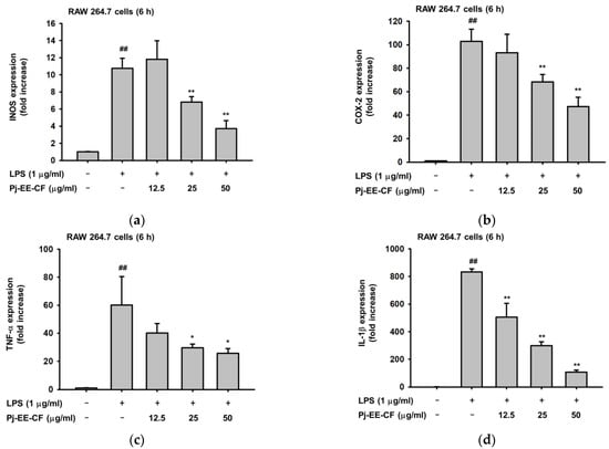 Total RNA was obtained from macrophage-like RAW264.7 cells (1 × 106 cells/mL) that were pretreated with Pj-EE-CF (0, 12.5, 25, and 50 μg/mL) for 30 min followed by induction with LPS (1 μg/mL) for 6 h. Paw tissues of mice were ground, and then stored at −70 °C until use. Total RNA was prepared using TRIzol per the manufacturer’s instructions, and then 1 μg of total RNA was immediately made for cDNA synthesis using a cDNA synthesis kit (Thermo Fisher Scientific, Waltham, MA, USA) per the manufacturer’s instructions. The qPCR was performed as previously reported [21]. The primer sequences used in this study are listed in Table 1.