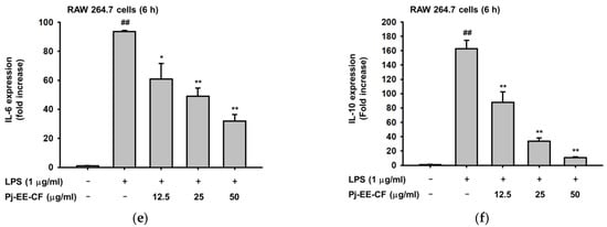 Effect of Pj-EE-CF on the expression of pro-inflammatory genes. The mRNA levels of iNOS (a), COX-2 (b), TNF-α (c), IL-1β (d), IL-6 (e), and IL-10 (f) were evaluated by qPCR on LPS-stimulated RAW264.7 cells. Results are expressed as mean ± standard deviation. ## p < 0.01 compared to normal group, and * p < 0.05 and ** p < 0.01 compared to control group (LPS alone). The p value was calculated using Bio-Rad CFX software.