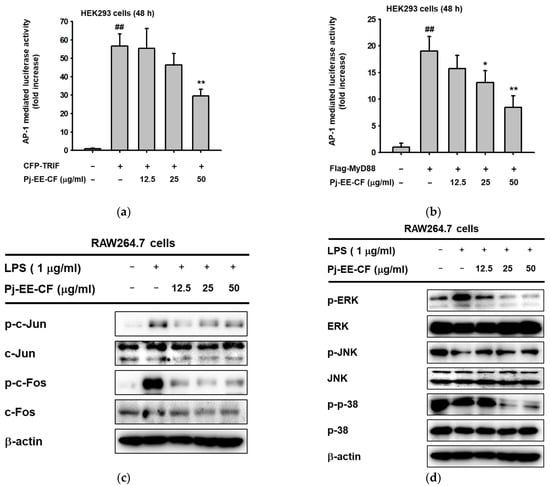 Next, due to the significant inhibitory effect of pro-inflammatory gene regulation, which was analyzed by qPCR, we sought to explore the transcriptional level using another assessment, the luciferase assay, using HEK293 cells co-transfected with either TRIF- or MyD88-mediated AP-1 activity. The results indicated that LPS alone significantly enhanced TRIF- or MyD88-mediated AP-1 activity (p = 0.0078 and p = 0.0035, respectively). However, treatment with up to 50 μg/mL of Pj-EE-CF concentration-dependently suppressed AP-1 luciferase activity induced by either TRIF or MyD88 (Figure 3a,b). In addition, we also examined the protein level of AP-1 subunit activation, specifically the phosphorylation of c-Jun and c-Fos, from whole lysates in LPS-induced RAW264.7 cells at different concentrations (12.5, 25, and 50 μg/mL). This finding showed that Pj-EE-CF decreased the level of p-c-Jun and p-c-Fos at all indicated concentrations (Figure 2c), which indicated that Pj-EE-CF could regulate the activity of AP-1 by inhibiting the dimerization of AP-1 via the reduction of activation of c-Jun and c-Fos. Afterward, to determine the target molecules of Pj-EE in the AP-1 pathway, we identified the effect of Pj-EE-CF at different concentrations in the upstream signaling molecules of AP-1 activation by an immunoblot analysis. MAPKs activation was generated by LPS-induced RAW264.7 cells. Among the MAPKs, the phosphorylation levels of ERK and of p38 were clearly decreased in the presence of Pj-EE-CF treatments at 25 and 50 μg/mL. However, the phosphorylation levels of JNK were not affected, despite the Pj-EE-CF treatment (Figure 2d). Taken together, these results suggested that Pj-EE-CF exerts anti-inflammatory responses through suppression of ERK and p38 in the AP-1 pathway.