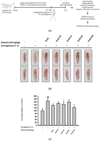 Using ICR mice (6 mice/group), paw edema was stimulated by a 100 μL subplantar injection of 1% newly made solution of carrageenan in PBS into both hind paws, as in the previously published report [27]. ICR mice were orally administrated with 100 μL of specific solutions for the different groups: normal group (0.5% CMC), carrageenan alone as control group (0.5% CMC), and treatment groups (100 mg/kg Pj-EE and its solvent fractions) once a day for 10 days. After that, carrageenan-induced paw edema was apparently observed in each group except the normal group (subplantar injection with PBS). After 3 h, the mice were sacrificed by CO2. Subsequently, redness and swelling was observed in both paws. The weight, thickness, and volume of the edema were measured as described previously [20].