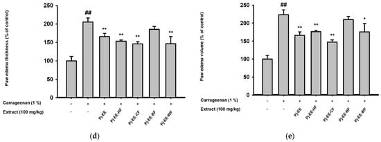 To determine the anti-inflammatory efficacy of Pj-EE and its solvent fractions in vivo, carrageenan-induced acute paw edema mouse models were used. Inflammation in both hind paws of each mouse was triggered by intraplantar injection of 1% newly prepared solution of carrageenan in PBS after pretreatment with 100 mg/kg Pj-EE and the four different solvent fractions once a day for 10 days, as illustrated in Figure 4a. As expected, carrageenan-induced paw edema showed prominent inflammatory symptoms, such as redness and swelling of the paws (Figure 4a). In contrast, 100 mg/kg of Pj-EE and its solvent fractions decreased the symptoms compared to the control group (carrageenan alone). In addition, we quantitatively measured the weight, thickness, and volume (Figure 4b–d) of each mouse paw to compare the severity of edema in each group. The water fraction following treatment with Pj-EE and Pj-EE-CF showed a significant reduction in paw weight compared to the control group (p = 0.0098, p = 0.0477, and p = 0.0354, respectively). However, Pj-EE-CF had the lowest measurement both of thickness and volume compared to 100 mg/kg of Pj-EE or the other solvent fraction groups, which suggested that it had more potent inhibitory effects, followed by Pj-EE, Pj-EE-HF, and Pj-EE-WF. Additionally, Pj-EE-BF did not show inhibitory symptoms on the carrageenan-induced paw edema mouse model.