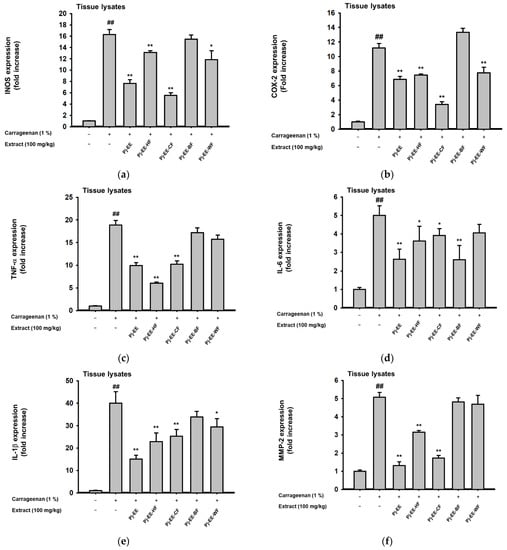 Effects of Pj-EE and four solvent fractions (HF, CF, BF, and WF) on the pro-inflammatory genes and cytokines production in carrageenan-induced acute paw edema models. (a–g) The expression of inflammatory genes, including iNOS (a), COX-2 (b), TNF-α (c), IL-6 (d), IL-1β (e), MMP-2 (f), and MMP-9 (g) from paw lysates was measured by quantitative real-time PCR. (h–j) Supernatant IL-1β (h), IL-6 (i), and TNF-α (i) levels of tissue lysates on carrageenan-triggered paw edema were examined by EIA. All of the data are expressed as mean ± standard deviation (n = 6). ## p < 0.01 compared to the normal group, and * p < 0.05 and ** p < 0.01 compared to the control group (inducer alone) by one-way ANOVA.