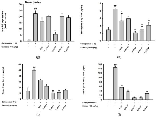 To evaluate the effects of Pj-EE and its solvent fractions at the molecular level, the level of inflammatory genes in the tissue lysate of paw samples was examined by qPCR (Figure 5a–g). In agreement with in vitro experiments, Pj-EE-CF possessed the highest inhibition of inflammatory genes, such as iNOS (Figure 5a), COX-2 (Figure 5b), and MMP-9 (Figure 5g), whereas Pj-EE-BF had the lowest, or barely any, activities. Additionally, for other pro-inflammatory genes such as TNF (Figure 5c), Pj-EE-HF showed more significantly reduced expression of TNF-α, followed by Pj-EE and Pj-EE-CF. In addition, in terms of the expression of IL-6 (Figure 5d), IL-1β (Figure 5e and MMP-2 (Figure 5f), the crude Pj-EE showed more prominent inhibition of the inflammatory genes, despite Pj-EE-CF still showing significant inhibition activities of these pro-inflammatory genes. To confirm that Pj-EE and its solvent fractions effectively inhibited the secretion of various cytokines, we further examined the production of IL1-β, IL-4, and TNF-α using enzyme immunoassay (EIA). Carrageenan-induced paw edema significantly generated the production of these cytokines, but treatment with 100 mg/kg PJ-EE and its four solvent fractions showed a reduction of these enzymes, with Pj-EE-CF displaying the highest attenuation of IL1-β (Figure 5h), IL-4 (Figure 5i), and TNF-α (Figure 5j) secretions. These data indicated that Pj-EE alleviated the inflammatory symptoms on carrageenan-induced paw edema, and, notably, Pj-EE-CF conferred more potent inhibition of almost all the assessments.