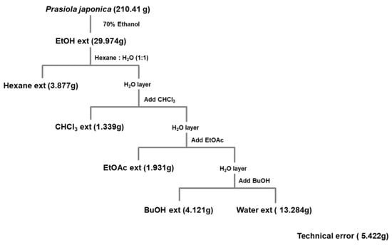 P. japonica was acquired from the Prasiola Japonica Research Center (Samcheok City, Gangwon-do, Republic of Korea) and was extracted as in previous studies [13,19,20]. Briefly, pieces of cut samples were extracted with 70% ethanol for 24 h at a ratio of 1:20 (w/v). Subsequently, the extract was filtered using 120 nm filter paper (No. 2, Advantec, Toyo Co., Tokyo, Japan), concentrated using a vacuum concentrator (Eyela New Rotary Vacuum Evaporator, Rikakikai Co., Tokyo, Japan), and then dried using a vacuum freeze dryer (Eyela FD1, Rikakikai Co.). The yield of the dried samples was measured. The final weight of the extract was 29.974 g (original sample: 210.41 g) with a yield of 14.24%. In addition, the ethanolic extract of P. japonica (crude extract) was then fractionated by various polarity solvents including n-hexane (Pj-EE-HF), chloroform (Pj-EE-CF), n-butanol (Pj-EE-BF), and water (Pj-EE-WF) as illustrated in Figure 6. The dried samples were kept in a −20 °C freezer for future use. For the in vitro studies, stock solutions of Pj-EE and of its solvent fraction were prepared by dissolving them with DMSO at a concentration of 100 mg/mL. When each experiment was performed, the stock solution was diluted to the desired final concentration of 12.5, 25, 50, 100, or 200 μg/mL using the suitable culture medium. For the paw edema mouse model experiments, the stock solution was made in 0.5% CMC at doses of 100 mg/kg.