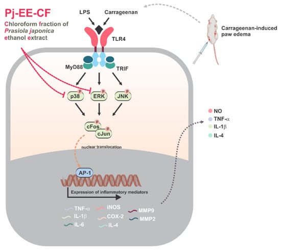 The present study, using in vitro and in vivo experiments, clearly indicated and supported the evidence of the anti-inflammatory effects of Pj-EE. Pj-EE-CF showed a particularly potent inhibition of inflammatory responses by targeting ERK and p38, thereby suppressing the activity of AP-1 that could result in attenuation of various inflammatory mediators and cytokines, as summarized in Figure 7. The anti-inflammatory activity of Pj-EE-CF is provided in the context of bioactive molecules that have demonstrated this function in previous studies. In the future, Pj-EE could be a good natural source of an anti-inflammatory agent, especially Pj-EE-CF. Further investigations are necessary to evaluate and isolate the bioactive molecules present in Pj-EE-CF.