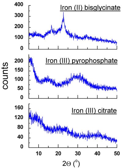 Diffraction patterns of iron (II) bisglycinate, iron (III) pyrophosphate and iron (III) citrate.